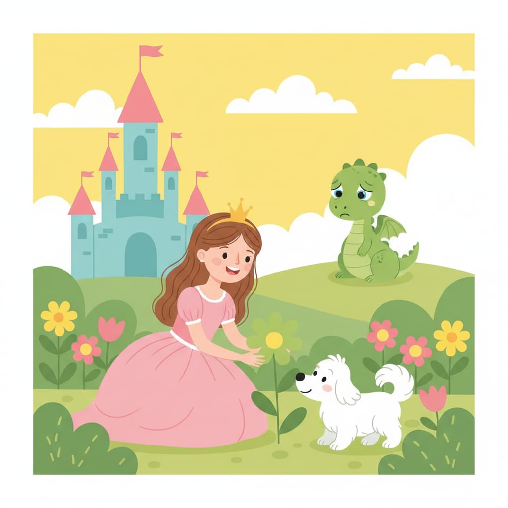 Había una vez una princesa llamada Lila, que vivía en un hermoso castillo. Ella siempre jugaba en el jardín con su perro, Max. Hoy, Lila estaba buscando flores para hacer un ramo especial.